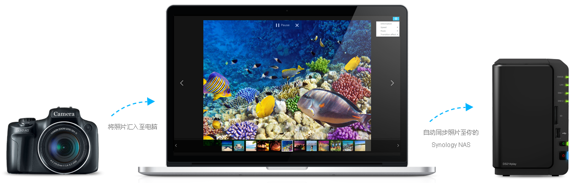對于專業(yè)攝影師而言,一個容易上手的備份方案至關重要。有了 Cloud Station,將照片同步到 Synology NAS 變得十分簡單。在匯入相機的照片后,你只需將文件丟進電腦里指定的文件夾,它們就會自動上傳到 Synology NAS。