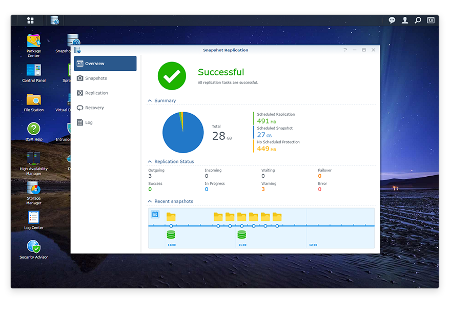 Synology DS916+ 可作為一個集中化的備份目的地。無論你是 Windows 或 Mac 使用者,你都可以使用 Cloud Station Backup 直接將電腦中的文件備份到你的 Synology NAS,任何時候做的修改都會自動備份到 DS916+。Mac 使用者也可享受熟悉的 Apple® Time Machine 備份經(jīng)驗 。你也可以將 DS916+ 上的數(shù)據(jù)備份到另一臺 DiskStation、其它 rsync 兼容服務(wù)器、外接設(shè)備,甚至是 Amazon® S3、Glacier cloud service、Microsoft Azure、SFR 和 hicloud 等公有云服務(wù)。Synology Hyper Backup 讓你可運行備份任務(wù)排程,以及將服務(wù)器回復(fù)到過去特定的時間點。同時,不同版本間只備份經(jīng)過修改的數(shù)據(jù),以降低消耗的存儲空間和處理時間。