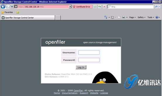 當 Openfiler 系統(tǒng)安裝并重啟完成后,對系統(tǒng)所有后續(xù)的配置過程,都是以 Web 方式配置完成的。這種全部基于 Web 的系統(tǒng)配置方式,使得配置過程變得更加簡易,同時也帶來了良好的用戶體驗。首先打開瀏覽器,輸入地址:https://IP:446。注意,此處輸入的 IP 地址為在系統(tǒng)安裝時所配置的固定 IP 地址。然后使用系統(tǒng)初始默認的用戶名和密碼進行登陸。用戶名為 openfiler,密碼為 password。系統(tǒng)初始的用戶名和密碼可以在第一次登入系統(tǒng)后進行重新設置。如圖所示。