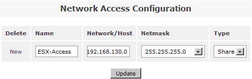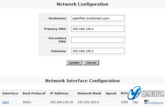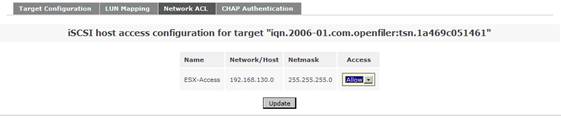 在系統(tǒng)菜單“System”菜單下的“Network Access Configuration”區(qū)域,配置允許訪問 Openfiler 系統(tǒng)的安全訪問控制列表。值得注意的是只有加入到 Openfiler 的網(wǎng)絡訪問控制列表中的網(wǎng)絡或者主機地址,才允許訪問 Openfiler 系統(tǒng)所提供的虛擬存儲服務。在網(wǎng)絡訪問控制列表中,既可以配置網(wǎng)段地址也可以配置單個主機地址。在本例填入 192.168.130.0 網(wǎng)段,設置類型為“Share”方式,添加完成后點擊“Update”完成系統(tǒng)配置更新。如圖