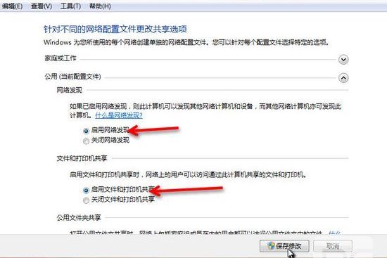 選擇 公共網(wǎng)絡(luò)---選擇以下選項(xiàng):?jiǎn)?dòng)網(wǎng)絡(luò)發(fā)現(xiàn)------啟動(dòng)文件和打印機(jī)共享-----啟用共享以便可以訪問(wèn)網(wǎng)絡(luò)的用戶可以讀取和寫入公用文件夾中的文件(可以不選)----關(guān)閉密碼保護(hù)共享( 注釋:其他選項(xiàng)默認(rèn)即可!)